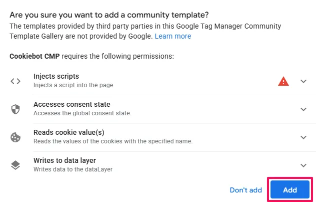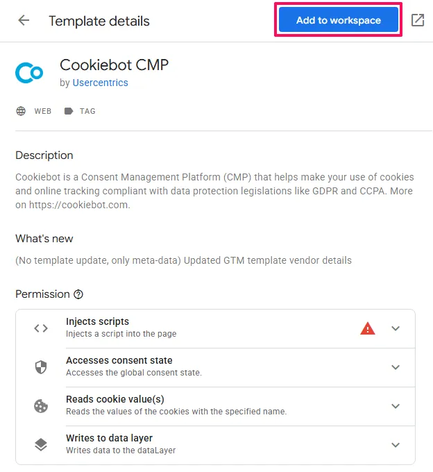 - Look for an “Update Available” indicator on the Cookiebot CMP template
