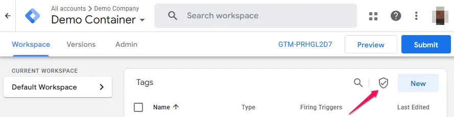 A new shield icon will now be visible in the main Tags workspace, granting access to the Consent Overview page.