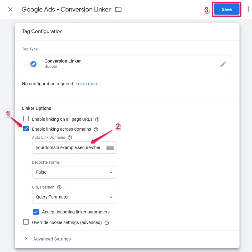 - For Google Ads Conversion Linker → Cross Domain Tracking With Conversion Linker in GTM (Legacy Setup).
