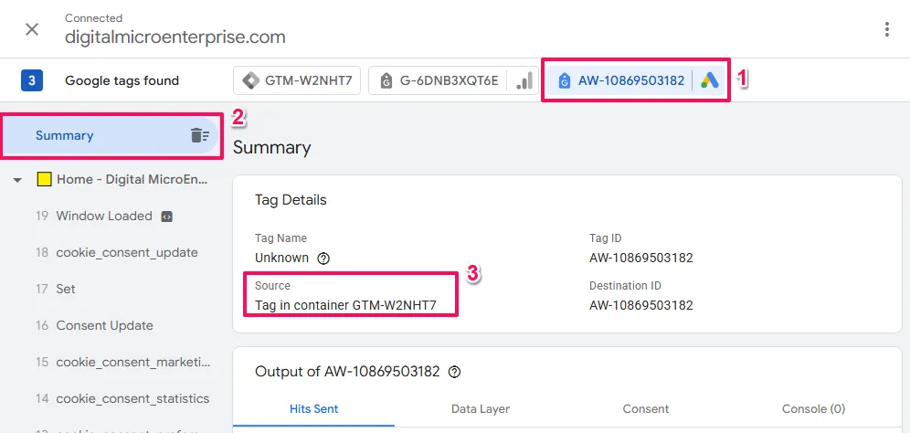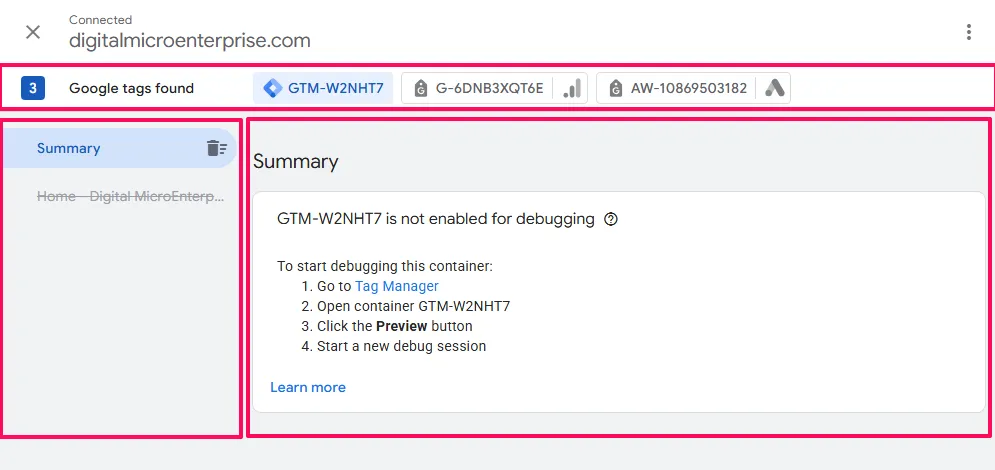 Look at the Google tags found section. This shows all Google tags detected on your current page.
