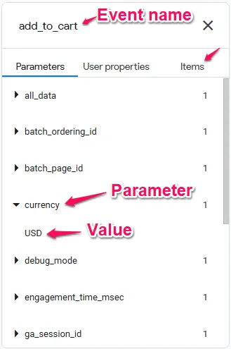Click any event to expand it and see all the parameters it contains. This is where you verify whether your tracking is working correctly. For example, if you’re tracking a button click, expand the event and check whether the button name, page location, and any custom parameters are present and correct.