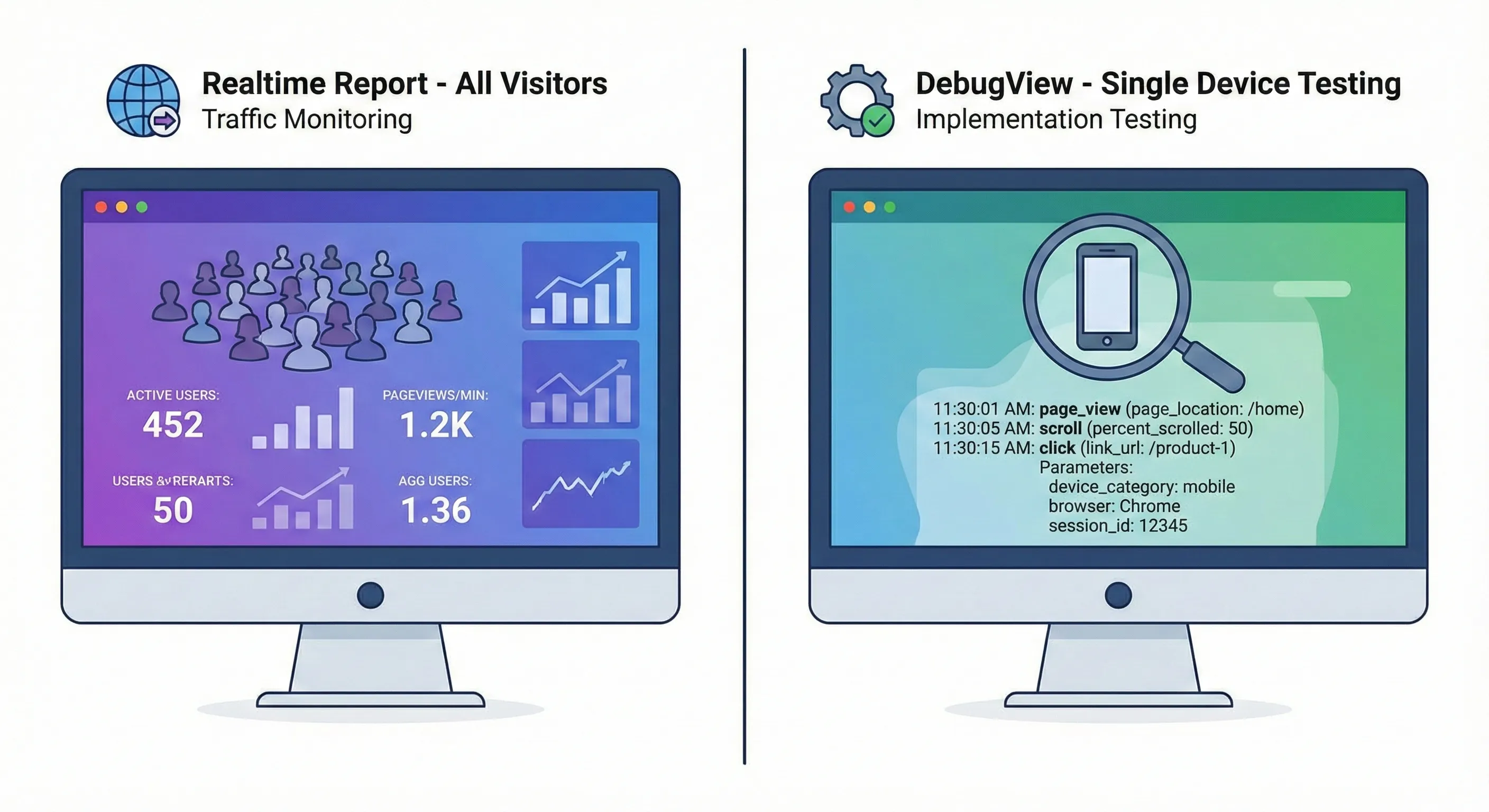 Many people confuse DebugView with GA4’s Realtime report because both show current activity. However, they serve completely different purposes, and understanding this difference is crucial.