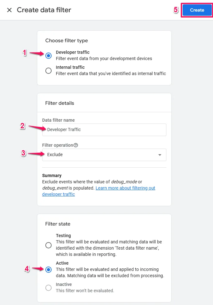 For most businesses, setting Developer Traffic to “Active” makes the most sense. However, if you’re troubleshooting why data isn’t appearing in reports, temporarily setting it to “Testing” can help you verify the data is actually being collected.