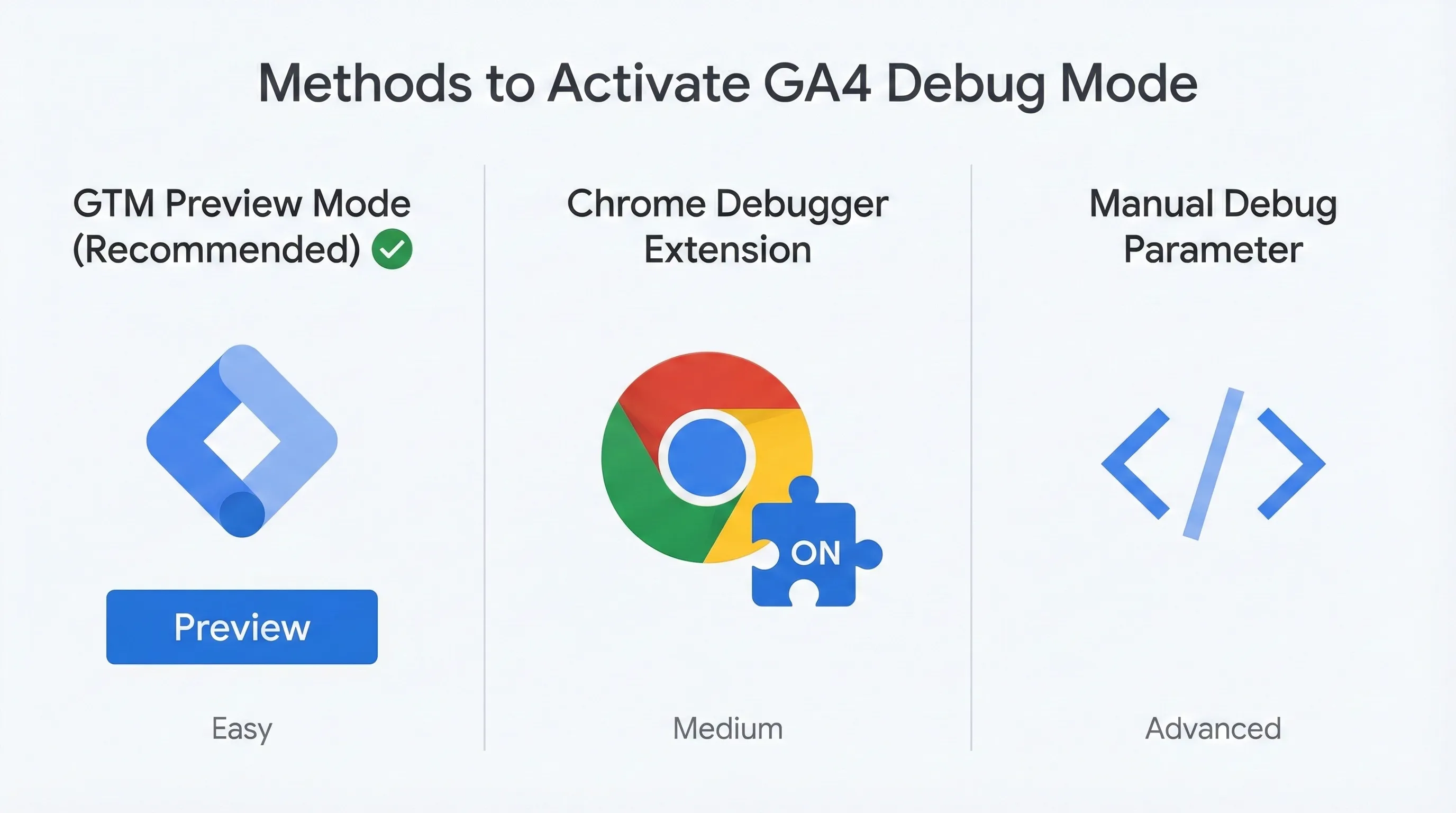 Prevention: Never use Method 3 (manual debug_mode parameter) on production environments. Stick to GTM Preview mode or the Chrome extension for testing live sites.