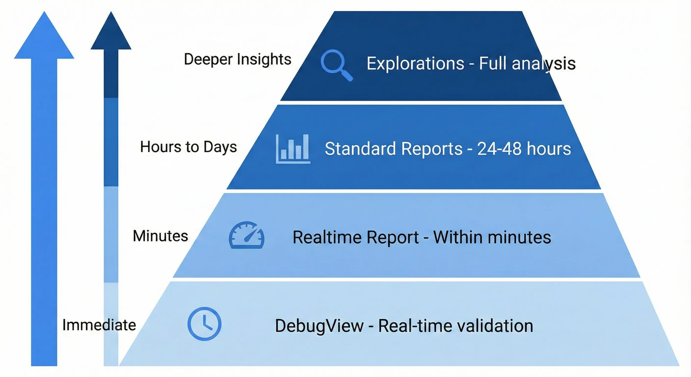 Never publish a new tracking implementation without validating it in DebugView first. The 24-48 hour processing delay in standard reports means you could lose two days of data before discovering a problem.