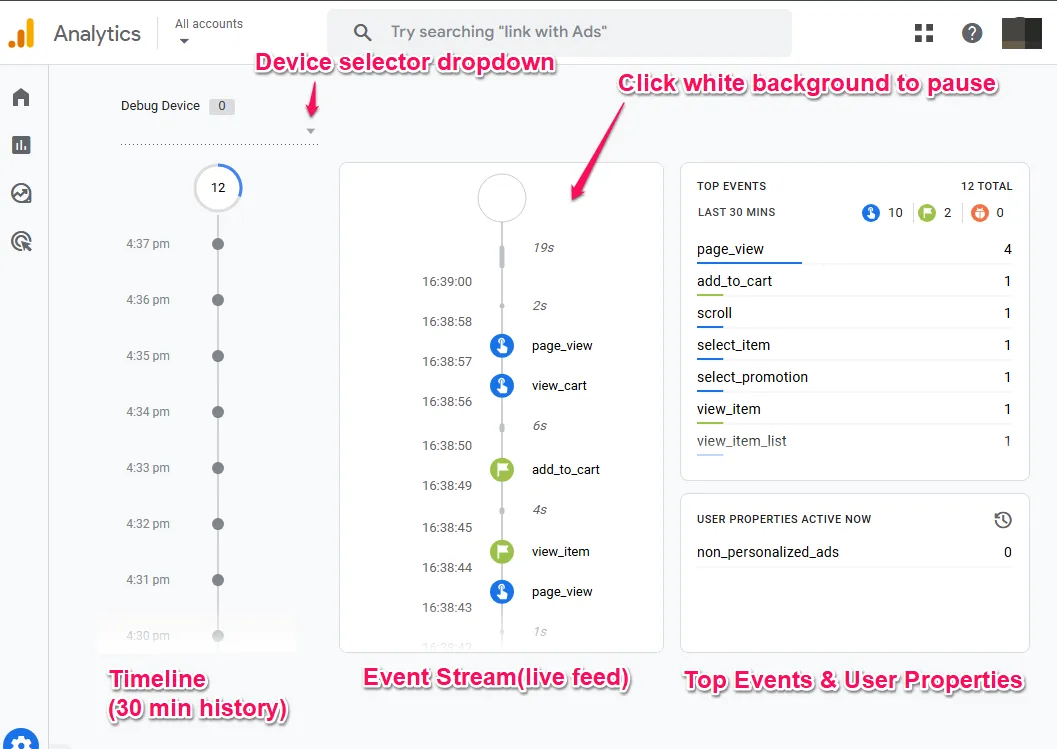 DebugView works completely differently. It isolates and shows you the data from one specific device (usually yours). When you activate debug mode on your browser or phone, DebugView displays every single event that device sends to GA4, along with all the parameters and properties attached to each event.
