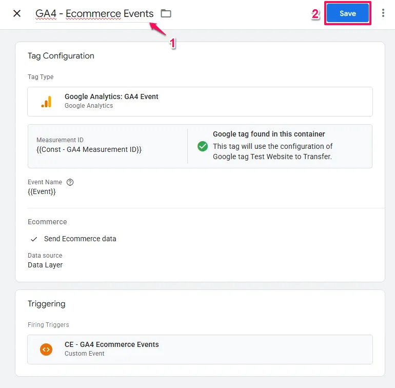 Click into the Triggering section and select the CE - GA4 Ecommerce Events trigger you created in Step 1.
