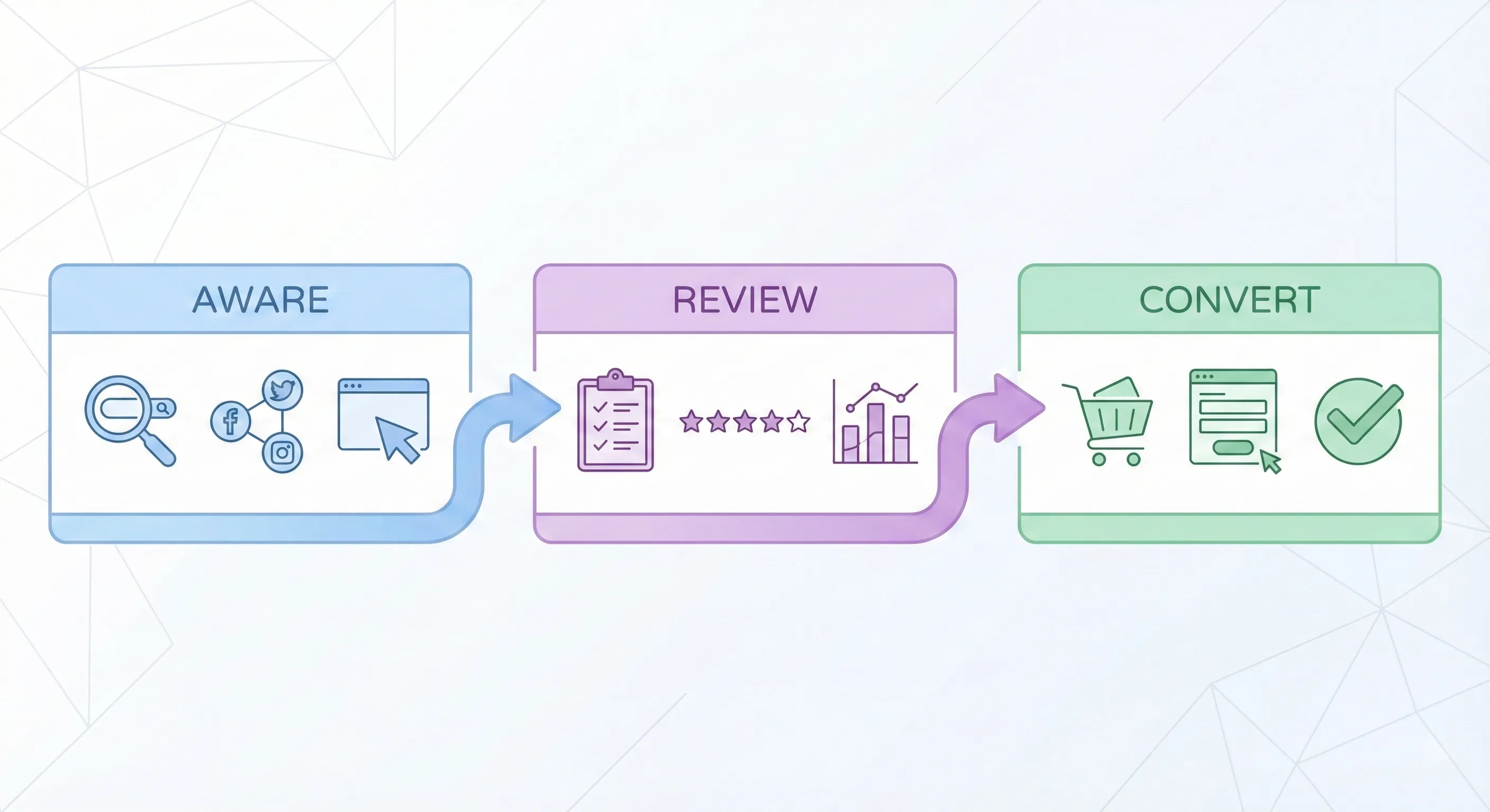 For web businesses, user behaviours follow a narrative arc that we call the ARC framework: Aware, Review, Convert.