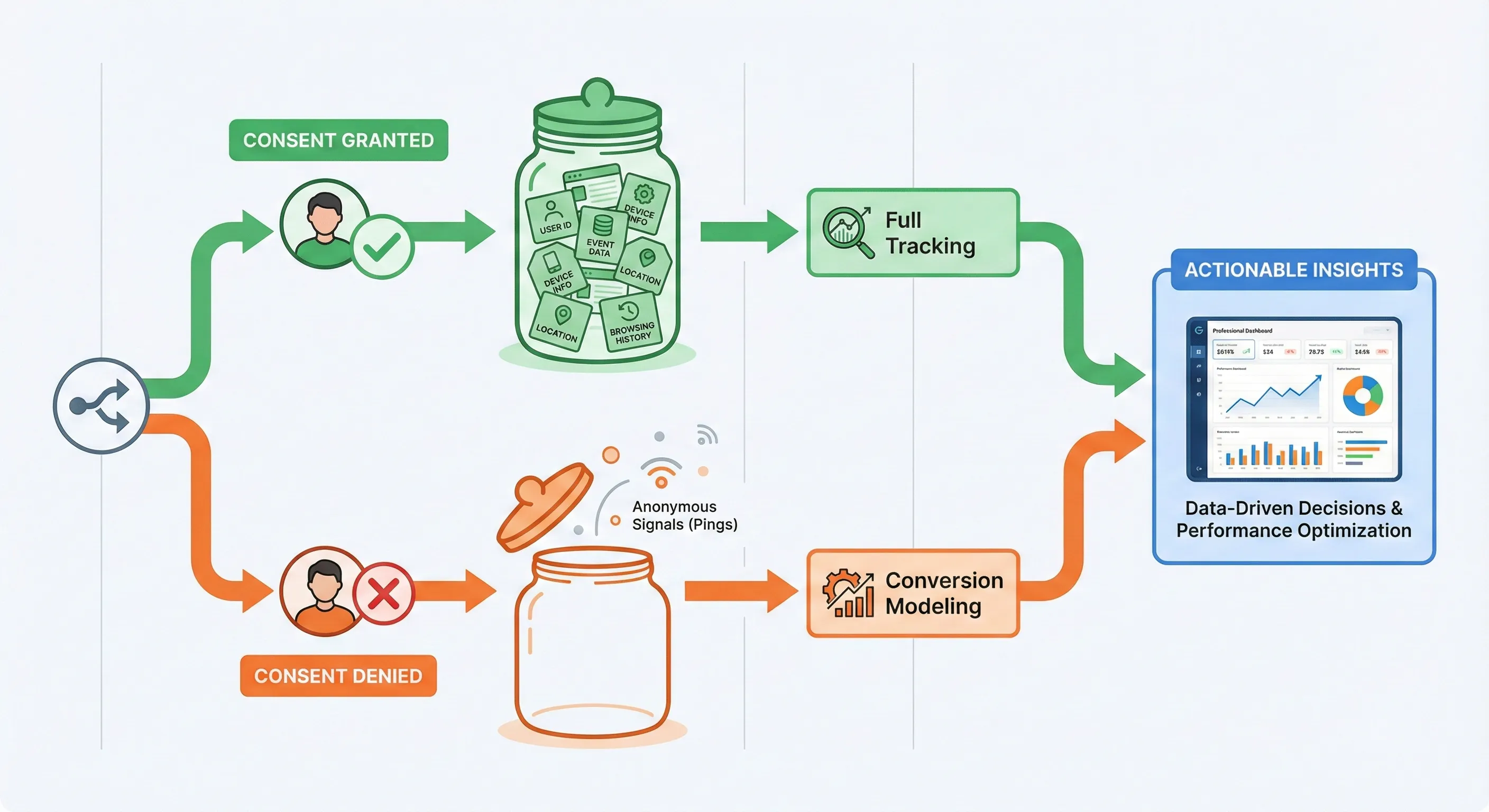 The critical feature is “Conversion Modelling.” Google uses these anonymous pings to model the behaviour of users who denied consent. Implementation partners report significant recovery of conversion data using this approach, allowing you to respect user privacy while maintaining visibility into campaign performance.
