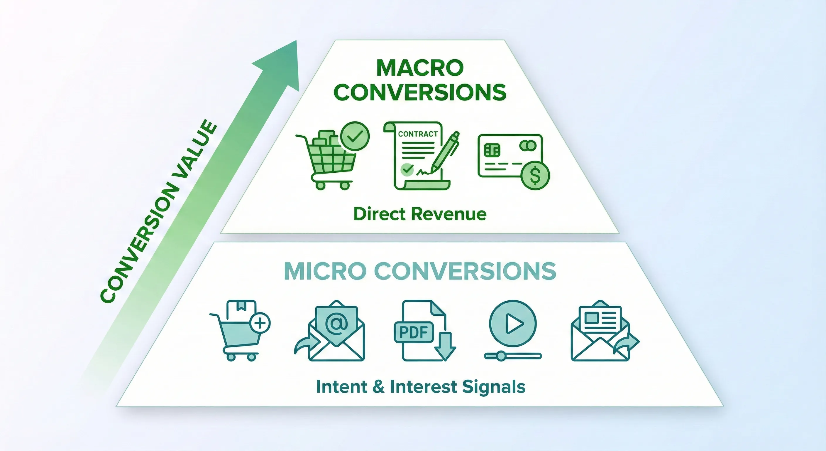 These conversion behaviours are the bridge between marketing activity and business results. Every outcome metric you care about (revenue, leads, customers) is built from these specific, measurable actions.