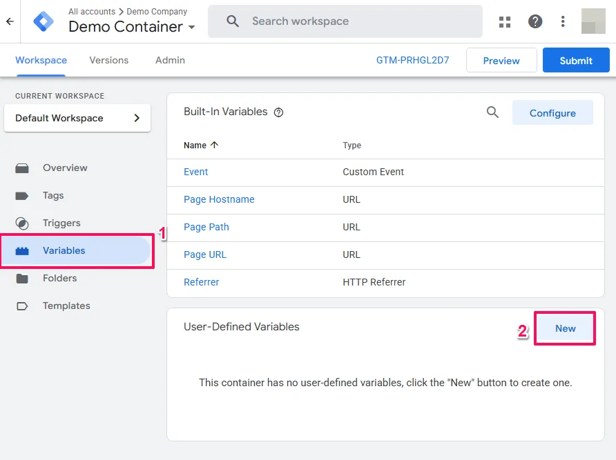 Open your Google Tag Manager workspace and click Variables in the left navigation menu.