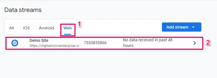 Click on Data Streams, then click on the web data stream that represents your website. If you haven’t created one yet, click Add stream, select Web, and enter your website URL and a descriptive name.