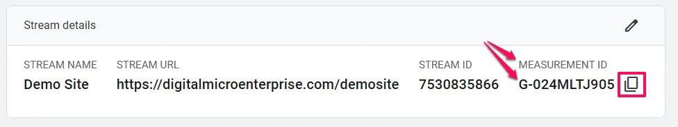 On the stream details page that slides out, you’ll see the Measurement ID in the top right corner. It’s a string of characters starting with G- followed by numbers and letters (something like G-1A2B3C4D5E). Click the copy icon next to it.
