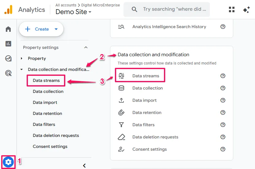 In the middle column under Property settings, look for Data Streams (you might also see it under a grouping called Data Collection and Modification).