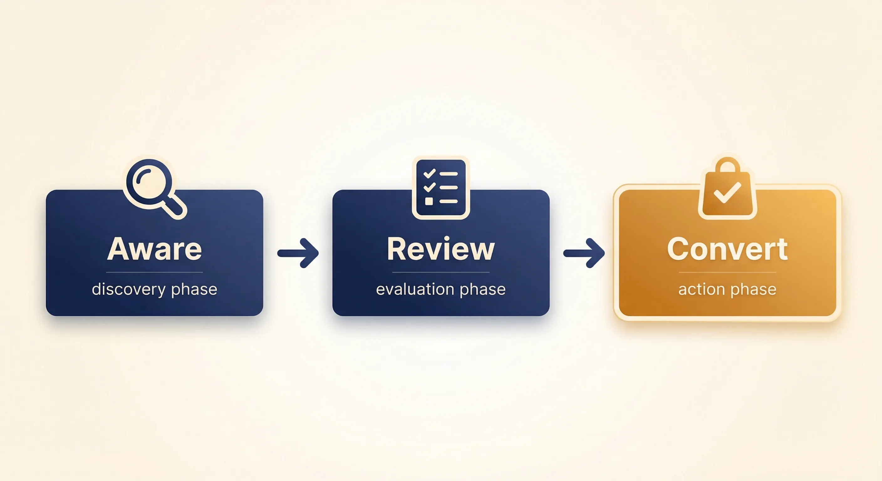 Once users are aware of your offer, they need to evaluate whether it meets their needs. Review behaviours include browsing multiple pages, reading product descriptions, watching demo videos, downloading resources, comparing features, checking reviews and testimonials, or engaging with interactive tools.