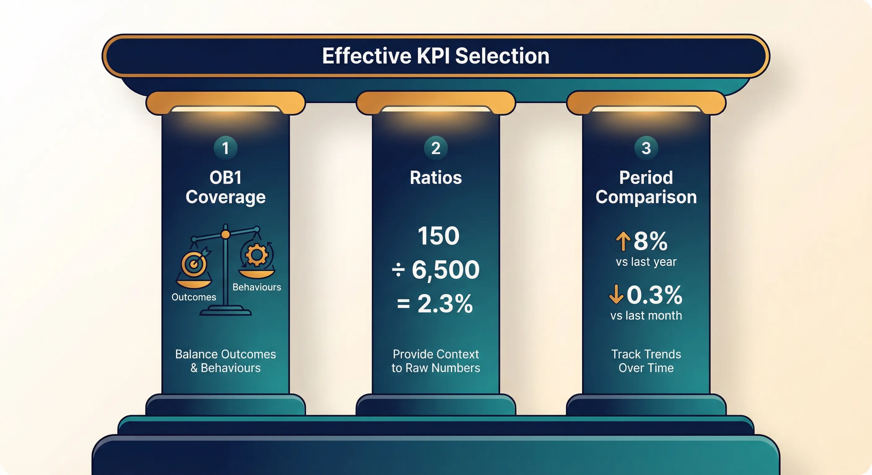 - Select Your KPIs: Choose 3-5 metrics for your dashboard that cover both outcomes and behaviours, combine ratios with raw numbers, and include period comparisons.