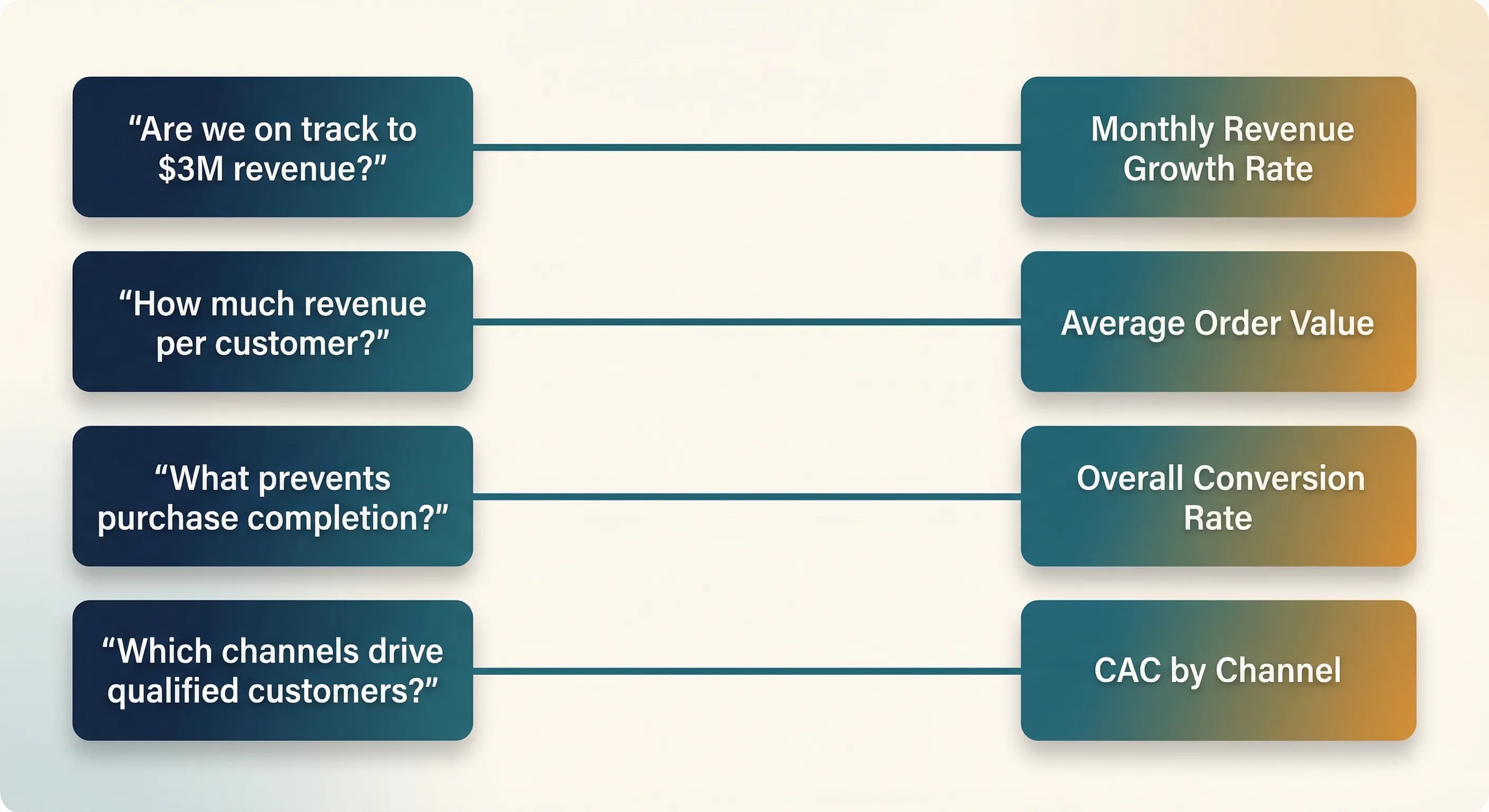 - “Are we on track to reach our $3M annual revenue goal?” → Requires: Monthly Revenue Growth Rate KPI (tracks progress toward annual target)
