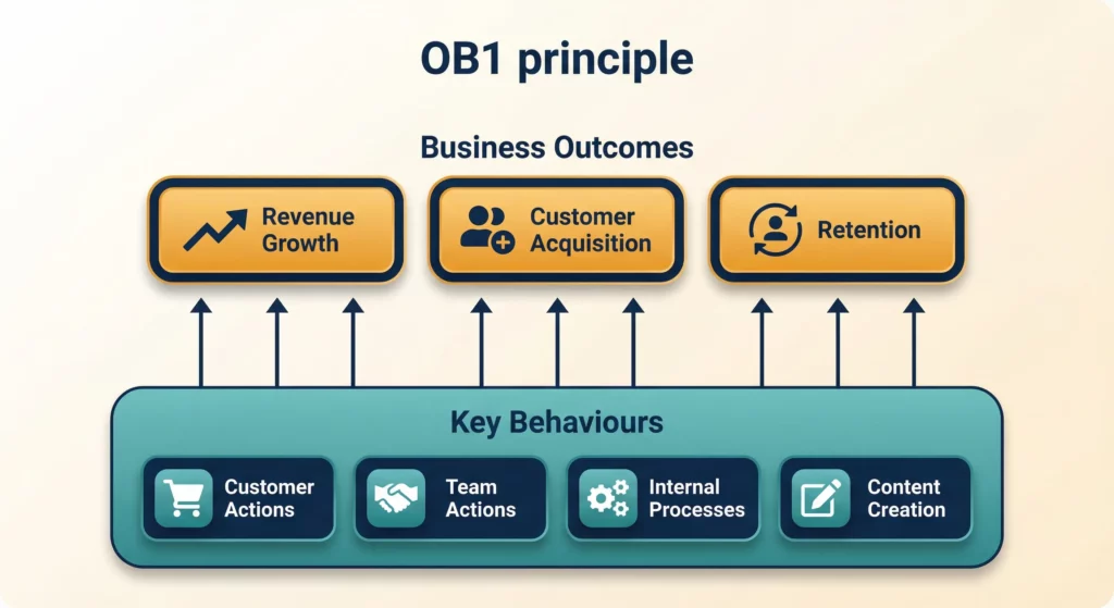 - OB1: Outcomes and Behaviours 1st: Define your business outcome and map the specific behaviours that create it. For web businesses, use the ARC framework to understand how users discover, evaluate, and convert.
