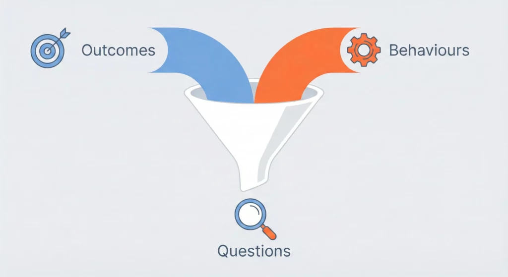 So how do we know which questions are the “right” ones? Good questions come from understanding two things: what you want to achieve (revenue, leads, growth, etc.) and how users behave to create those outcomes. This connection between desired outcomes and user behaviours is the foundation of effective measurement.