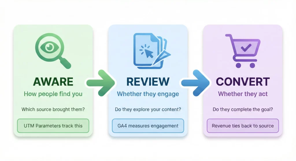 How to Build Your Marketing Measurement Foundation shows you how these components work together—Google Tag Manager for deployment, the data layer for structured tracking, GA4 for analytics processing, UTM parameters for attribution, conversion tracking for optimization, and Looker Studio for unified reporting—creating a system where every question has a reliable answer.