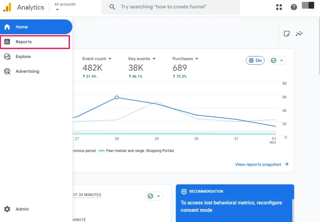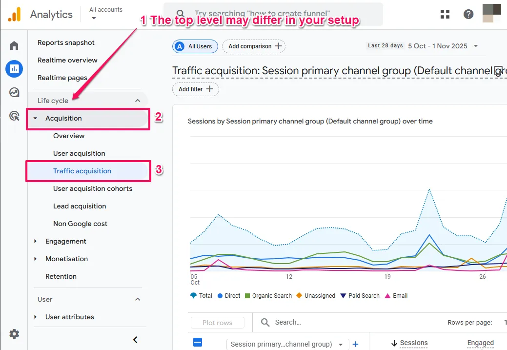 In the left-hand menu of GA4, navigate to: Reports → Acquisition → Traffic acquisition