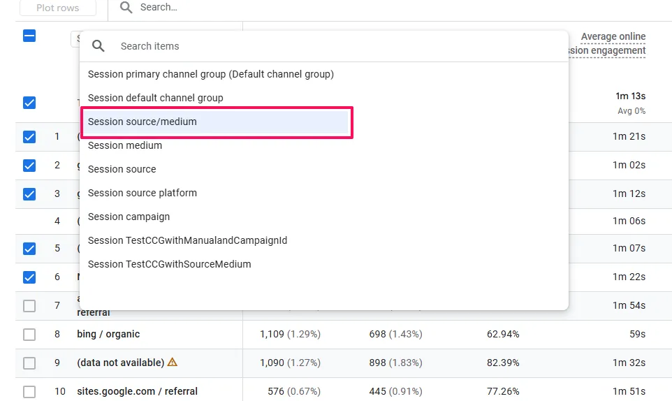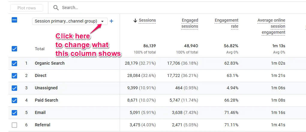 - Click the dropdown at the top of the data table (it says “Session default channel group”)