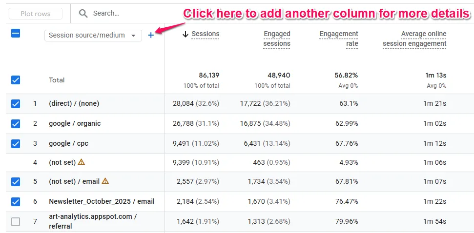 By default, the report groups traffic into broad categories like “Organic Search” and “Direct.” To see your specific UTM tags: