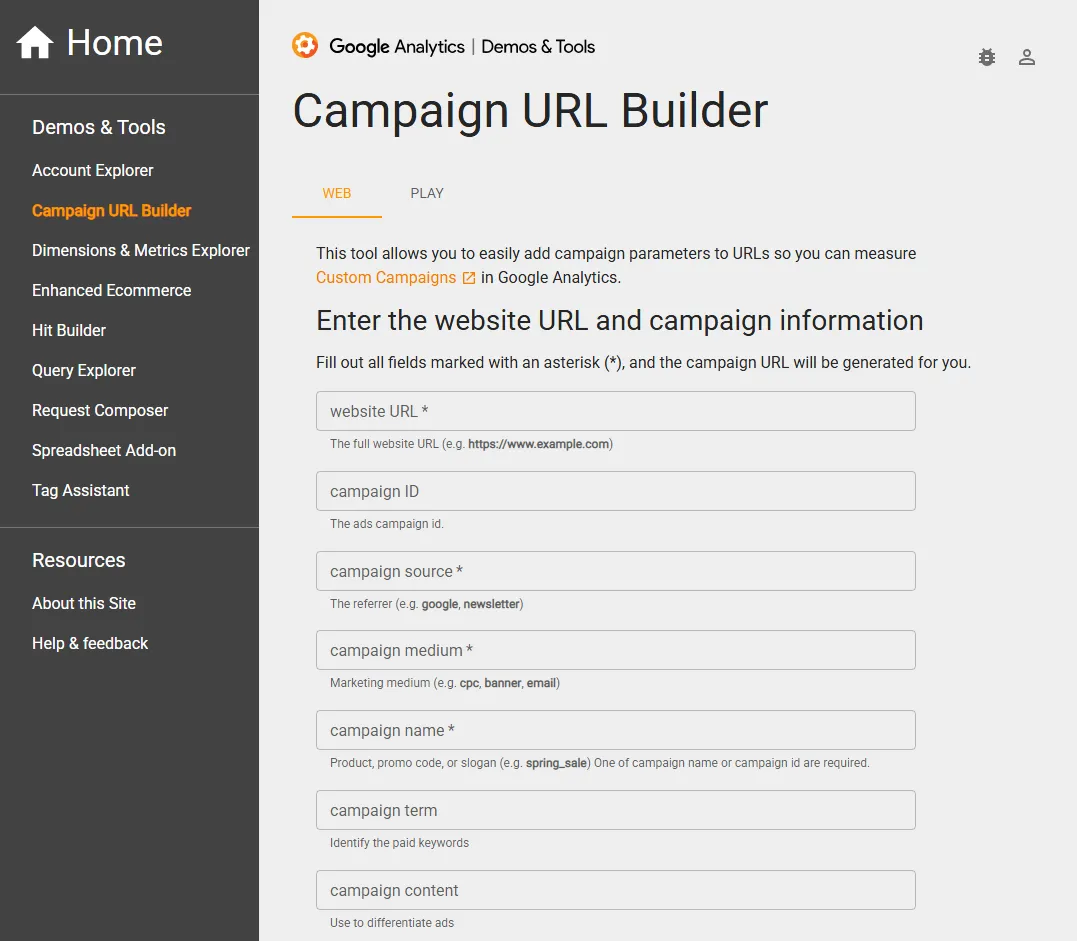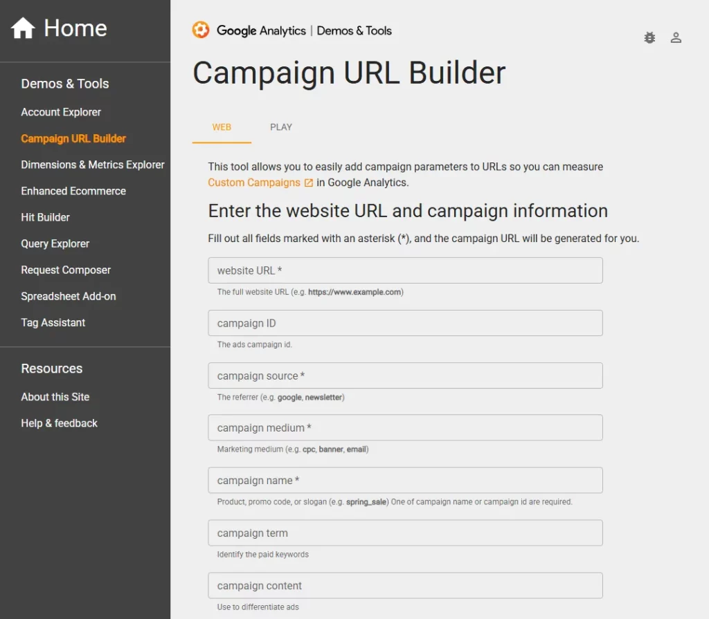 Navigate to Google’s Campaign URL Builder tool. You will see a simple form with fields for your URL and the five UTM parameters.